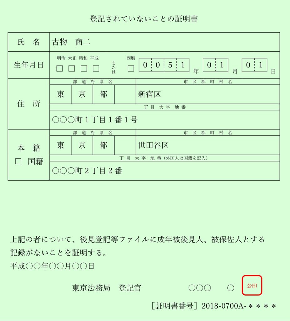 「登記されていないことの証明書」とは、成年後見制度の利用者を登記(登録)している「後見登記等ファイル」に登録されていないことを証明する書類です。