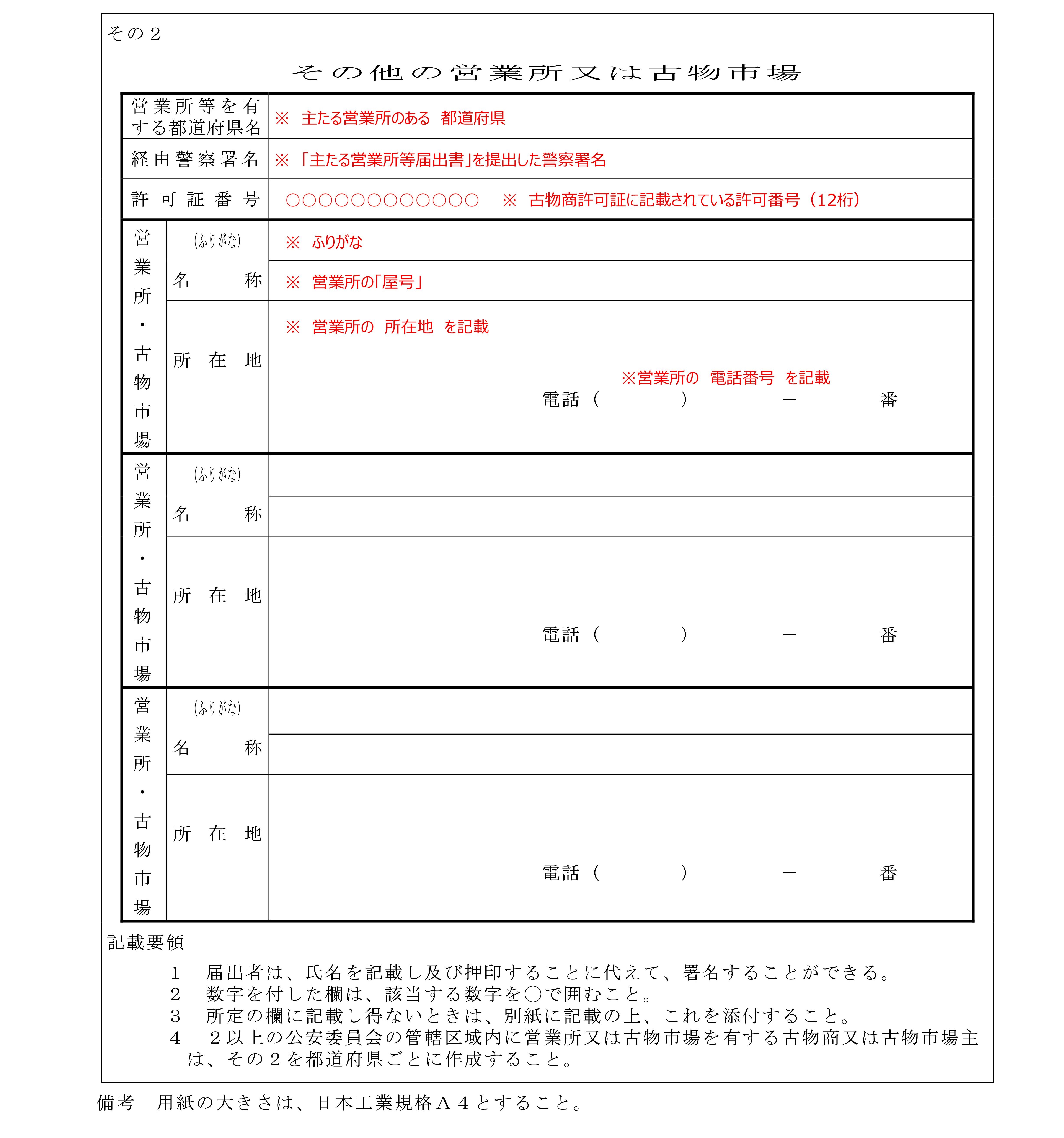 B店、C店、D店の3店舗については、「その他の営業所又は古物市場」(様式:別記様式(附則第2項関係) その2)へ記載し、併せて提出しましょう。