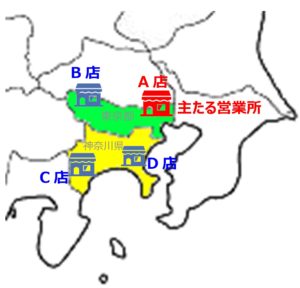東京都:2店舗(A店、B店)、神奈川県:2店舗(C店、D店)の営業所を設け古物営業を行い、A店を「主たる営業所」とする場合についてみてみます。