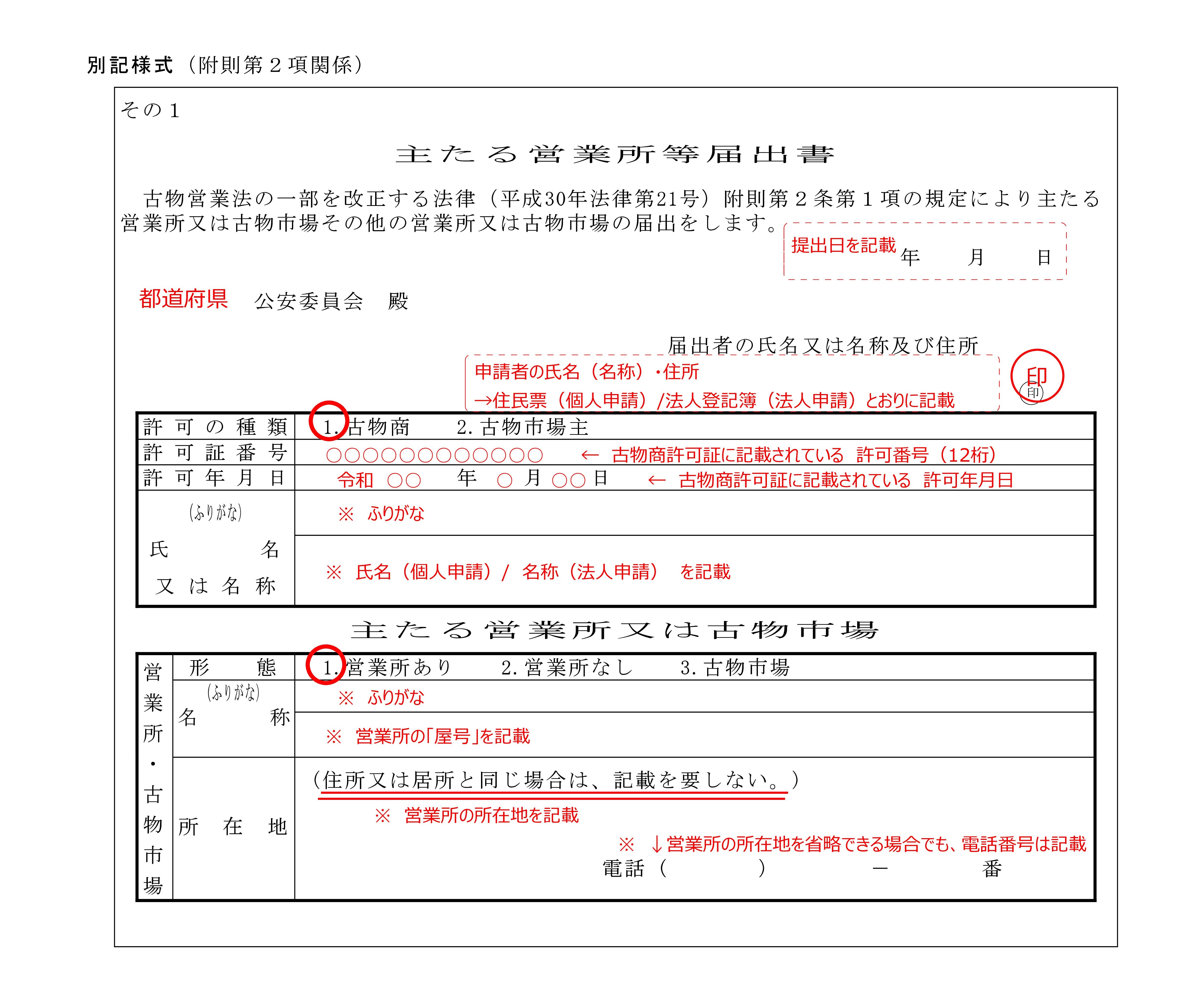 ・すでに古物商許可を取得している場合は、「主たる営業所等届出書」を提出しなければならない。