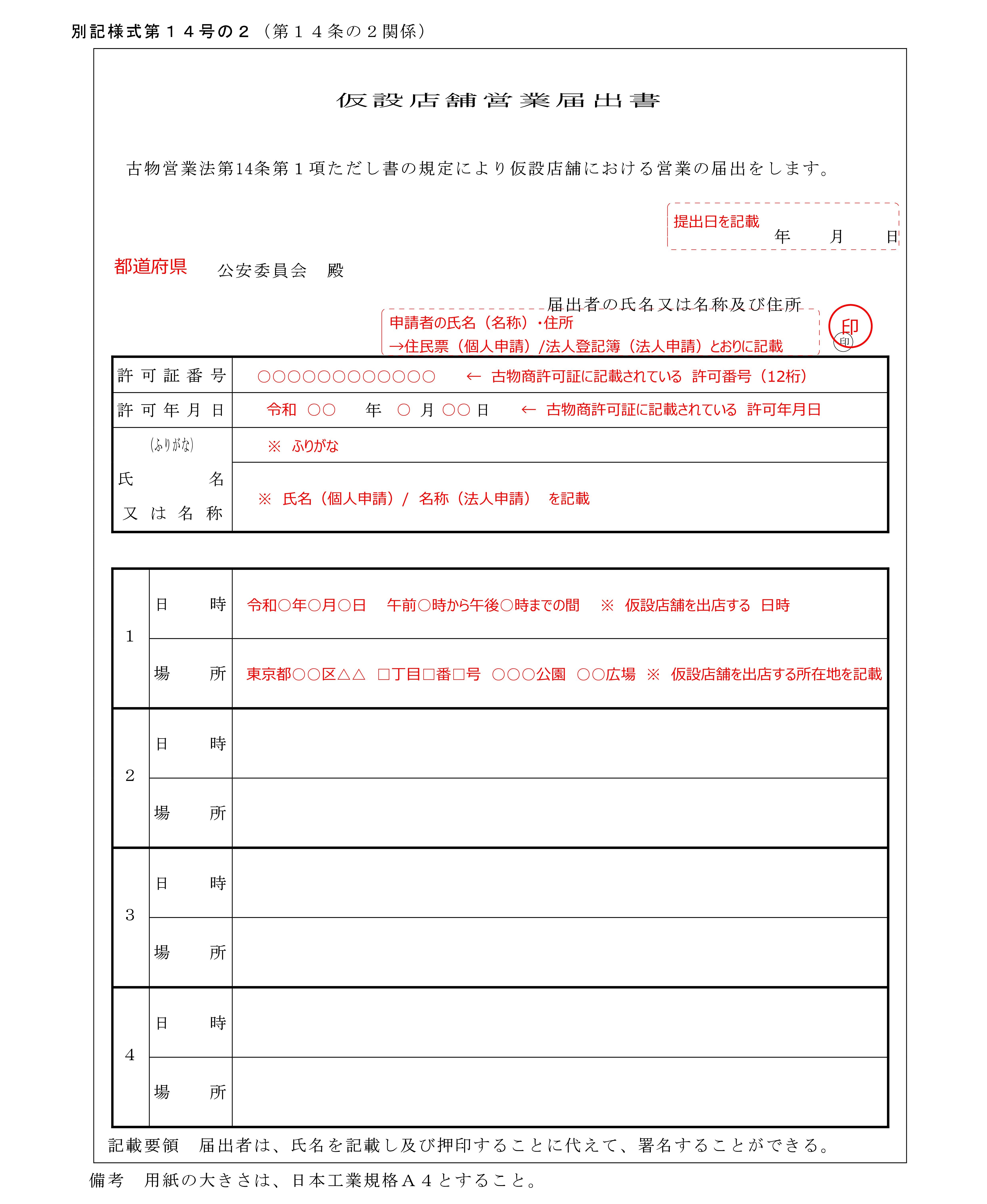 届出の期間については、仮設店舗において古物営業を行う3日前までに、仮設店舗の所在地を管轄する警察署の生活安全課に「仮設店舗営業届出書」(様式:別記様式第14号の2)を提出します。